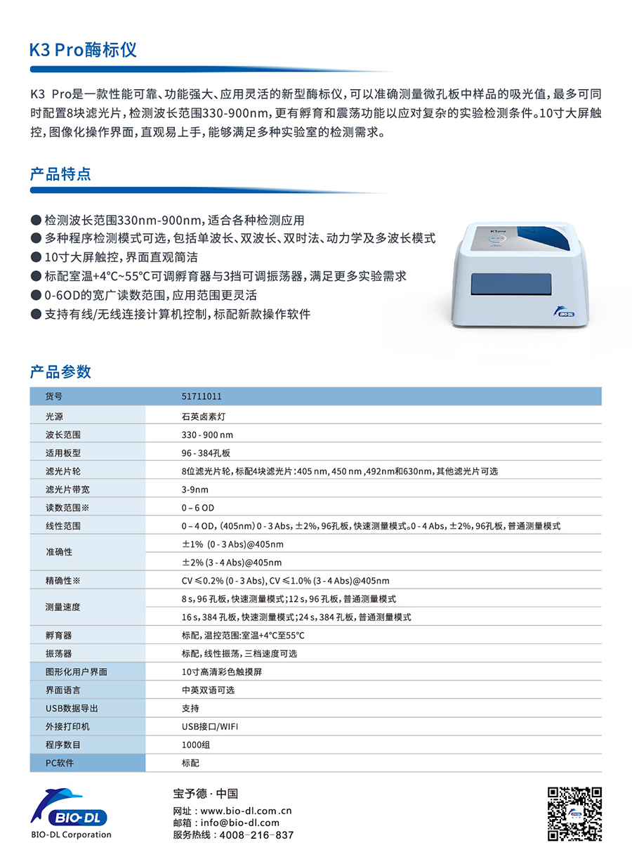 K3 Pro是一款性能可靠、功能強大、應用靈活的新型酶標儀,可以準確測量微孔板中樣品的吸光值,最多可同時(shí)配置8塊濾光片,檢測波長(cháng)范圍340-850nm,更有孵育和震蕩功能以應對復雜的實(shí)驗檢測條件。10寸大屏觸控,圖像化操作界面,直觀(guān)易上手,能夠滿(mǎn)足多種實(shí)驗室的檢測需求。